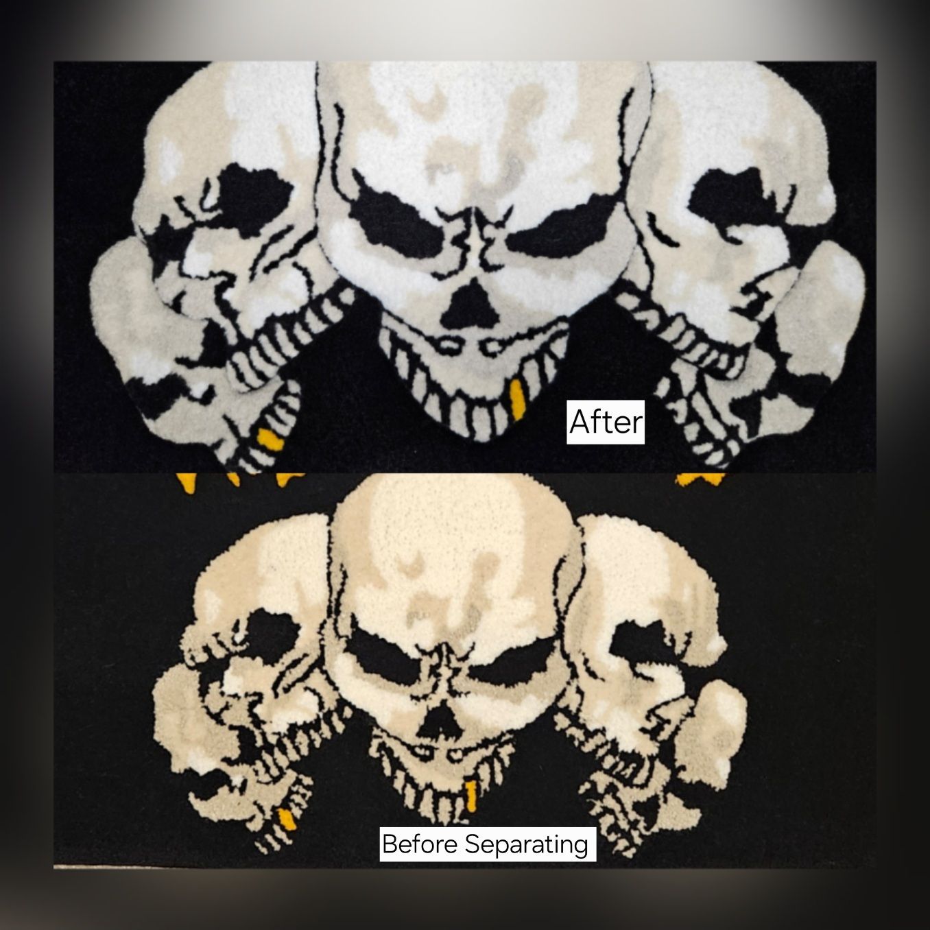 Colors separated; rug remains flat; images and characters do not have a 3D effect